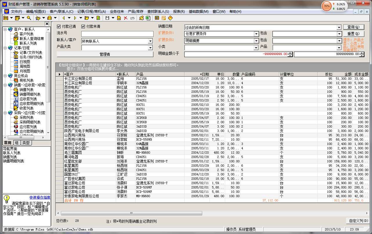 ■导航界面简洁明了,操作方式方便自然,易学易用; ■在联系人界面可以方便的查看、记录联系人所有的相关业务,而不需要来回打开窗体; ■所有的列表均能方便的导出为 Excel 文档,供用户产生符合需要的报表存档; ■联系人的增量查找操作简单、功能强大, 可以保留5次最近的查询历史,随时撤销到上一步查询; ■联系人的快速操作功能尤其方便, 输入姓名或者单位拼音简写,或者电话号码的一部分等即可查询到相应的联系人; ■联系人的分类灵活, 可以安装“类型”或者“组”两种不同的分类方式进行分类; ■绝大部分常用基本信息均支持智能记忆,也可设定为手工维护, 比如“费用类型”等; ■集成了超值的多种辅助功能,如信封设计、打印功能, 邮编区号查询功能。